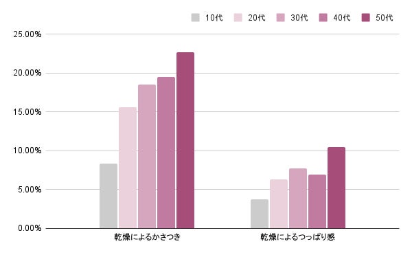 当社で定期的に実施しているアンケート調査*² にて、デリケートゾーンに関するお悩みを1万4千人ほどの女性に聞いたところ、「乾燥によるかさつき」17.9%、「乾燥によるつっぱり感」7.3%と乾燥が原因で悩んでいる女性が多いことがわかりました。年代別にみると、年齢とともに乾燥悩みが増える傾向も確認されています。