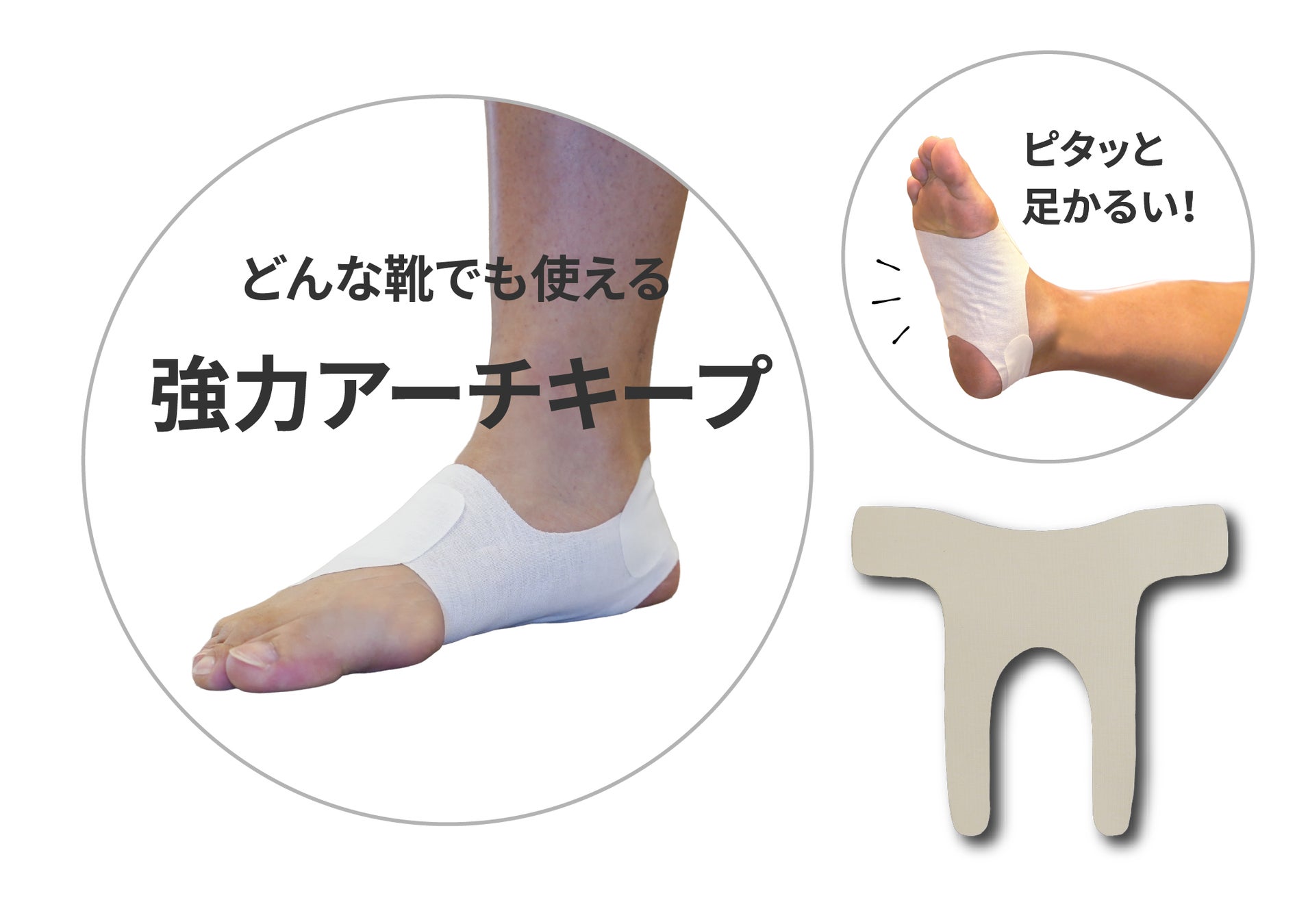 特に、「まるでいんそーるテープ は、内側縦アーチの保持に特化した設計が施されており、医療用インソールと同等の内側縦アーチ保持効果を確認しています。