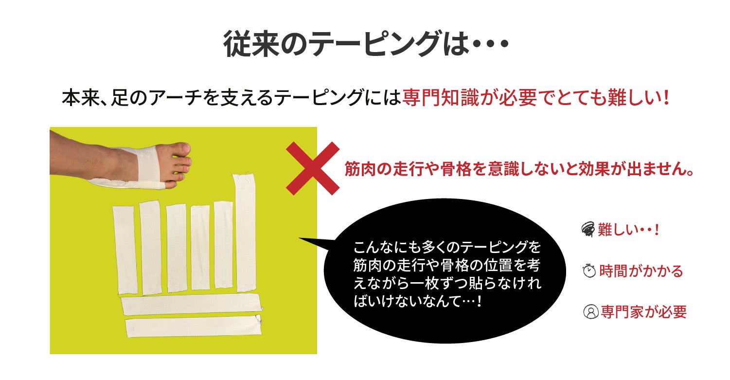「まるでいんそーるテープ 」は、これまで専門的な教育を受けた理学療法士等しか実施できない足底テーピングを”1人で簡単に貼れるようにした画期的な商品”としてこの度発売に至りました。