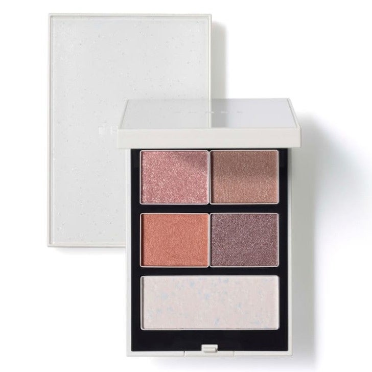 煌びやかなグリッターやメタリック、滑らかなサテン、光をチューニングするセミマット、4種のアイカラーに、ひとはけでソフトなヴェールを仕込む“光らない”ブライトニングパウダーをセット。