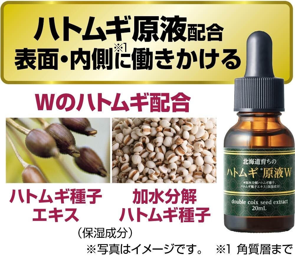 北海道産ブランドハトムギ「北のはと」から抽出されたWのハトムギ(ハトムギ種子エキス*²・加水分解ハトムギ種子*²)を配合。肌表面・内側*³に働きかけ、うるおいを与えなめらかさを感じるお肌に導きます。