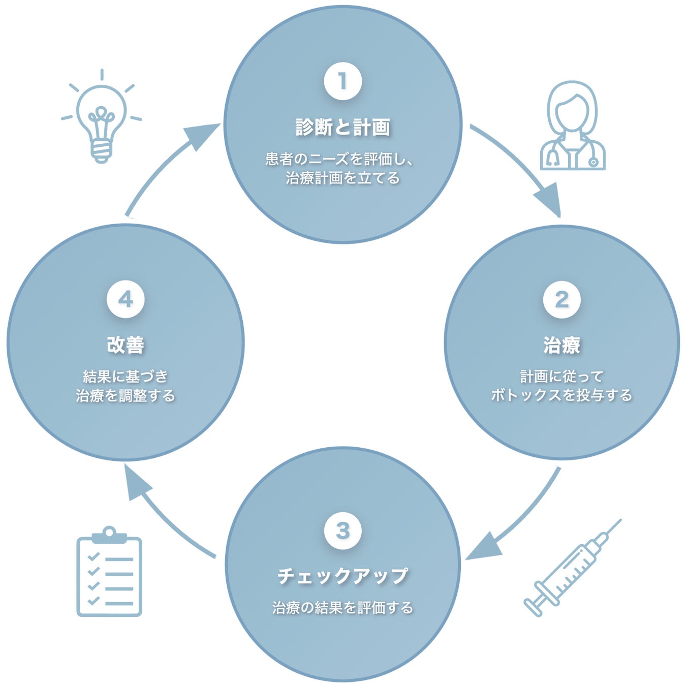 ビジネスでも重要とされるPDCA(計画→実行→評価→改善)と同じように、術後の評価、そしてその評価に基づき改善・最適化する。これが当院のボトックス治療の強みです。