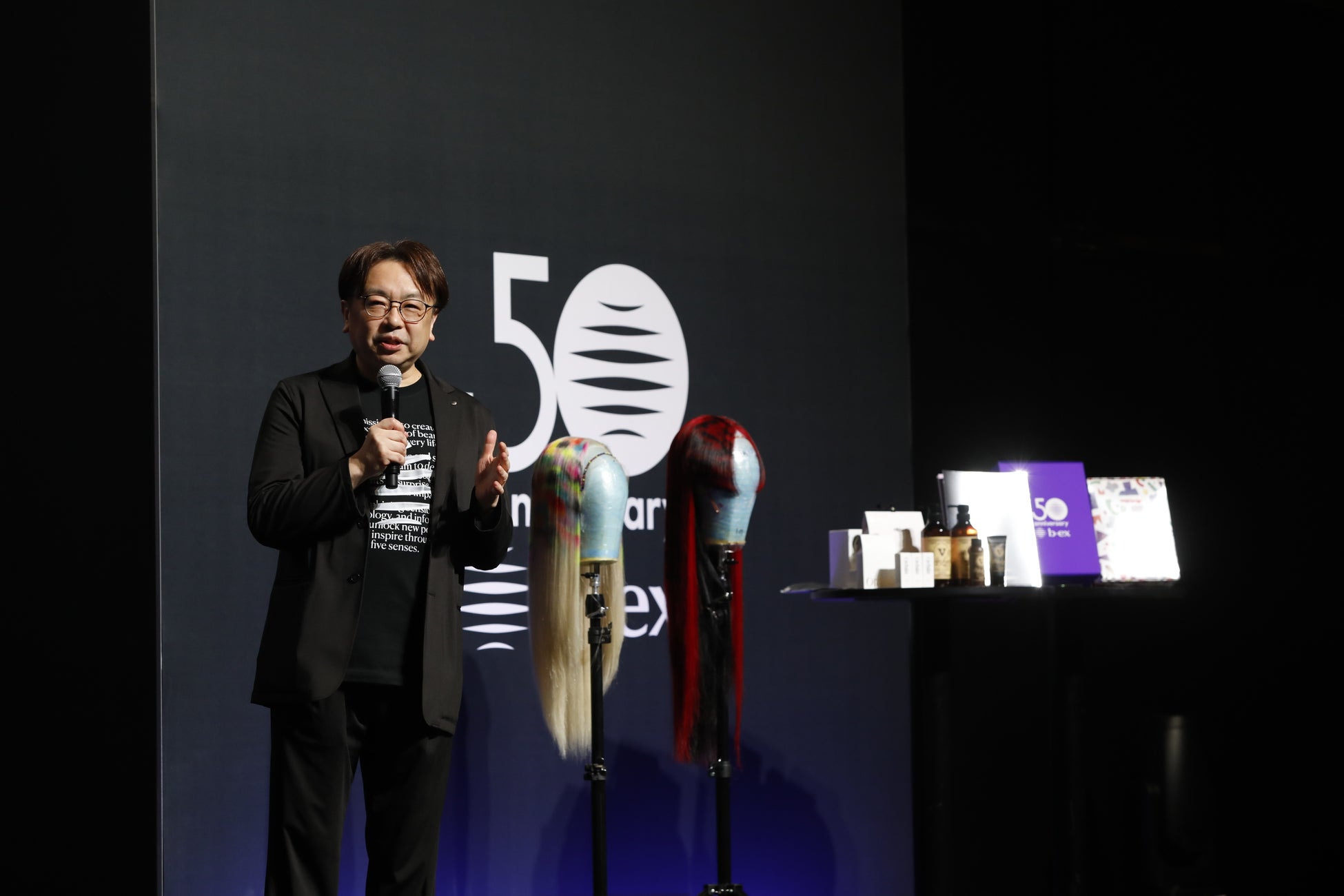 メディア向け発表会冒頭では、b‐ex GROUP グループCEO 福井敏浩より、創業50周年にかける想いと今後の展望についてご説明しました。その後、b-ex 取締役 常務執行役員CMO 竹内秀彦より各ブランドの製品紹介、明日花キララさんとコラボしたヘアオイルブランド「Maison Orchidée(メゾンオルキデ)」のBeB TOKYO限定商品紹介を行いました。注力ブランドの製品紹介パートでは、ヘアケアブランド「DeepLayer(ディープレイヤー)」の共同開発サロンであるH.company代表 小玉重太さんより新製品のご紹介、さらにWWDJAPAN編集長 村上要さんを交えた「美容トレンドやクリエイティブについて」のトークを実施。加えて、プロフェッショナル向けヘアカラーブランド「KIRATERA(キラテラ)」コーナーでは、THE SLICK代表 樗木佑太さんおよびPELE代表 RYUSEIさんからKIRATERA開発に込めた想いを語られた後、お二人が審査員をご担当された「KIRATERA CONTEST」についての印象についてお話されました。