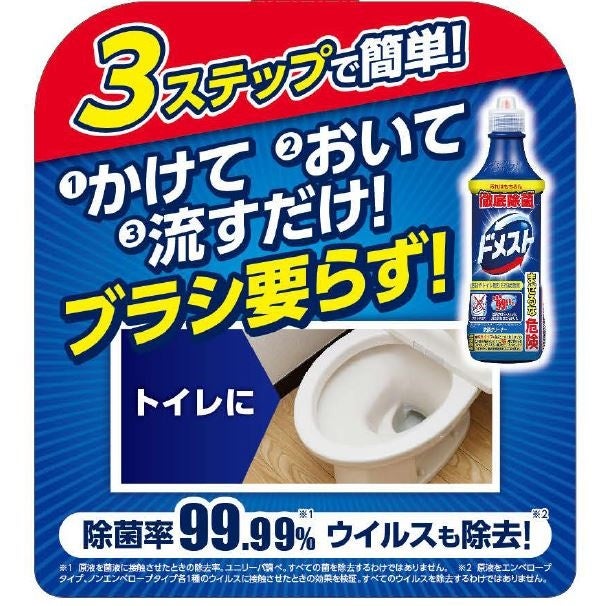 ドメストの除菌率は99.99%*2。バイ菌を徹底除菌して、汚れはもちろん、繁殖によっておこる悪臭やヌメリも退治します。原液を使用する場合、トロっとした粘度の高い液がはりつくので、普段は見えづらく、掃除のしづらい便器の裏も「かけて、おいて、流すだけ」で、確実に洗浄・除菌ができます。また、ウイルス対策*4にも効果的です。