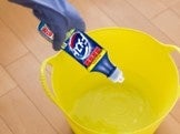 ゴム手袋をつけて、水1リットルにドメストまたはドメスト ホワイト&クリーン1押し程度(約10ml)を入れる。