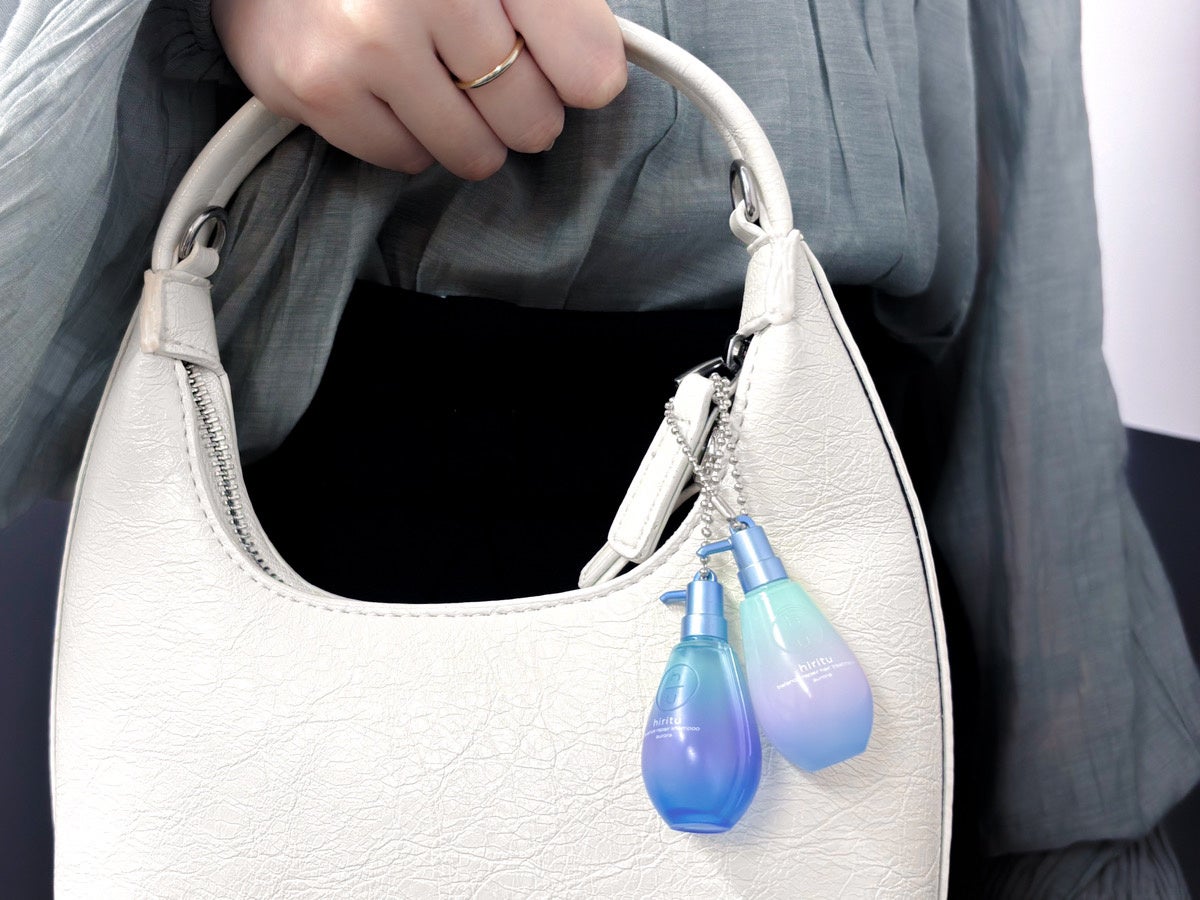 hirituの「スムース」・「モイスト」・「オーロラ」シリーズのシャンプー・トリートメント6種をご用意。ボトルにはボールチェーンが付いており、バッグやポーチなどお好きなところにつけてお楽しみいただけます。