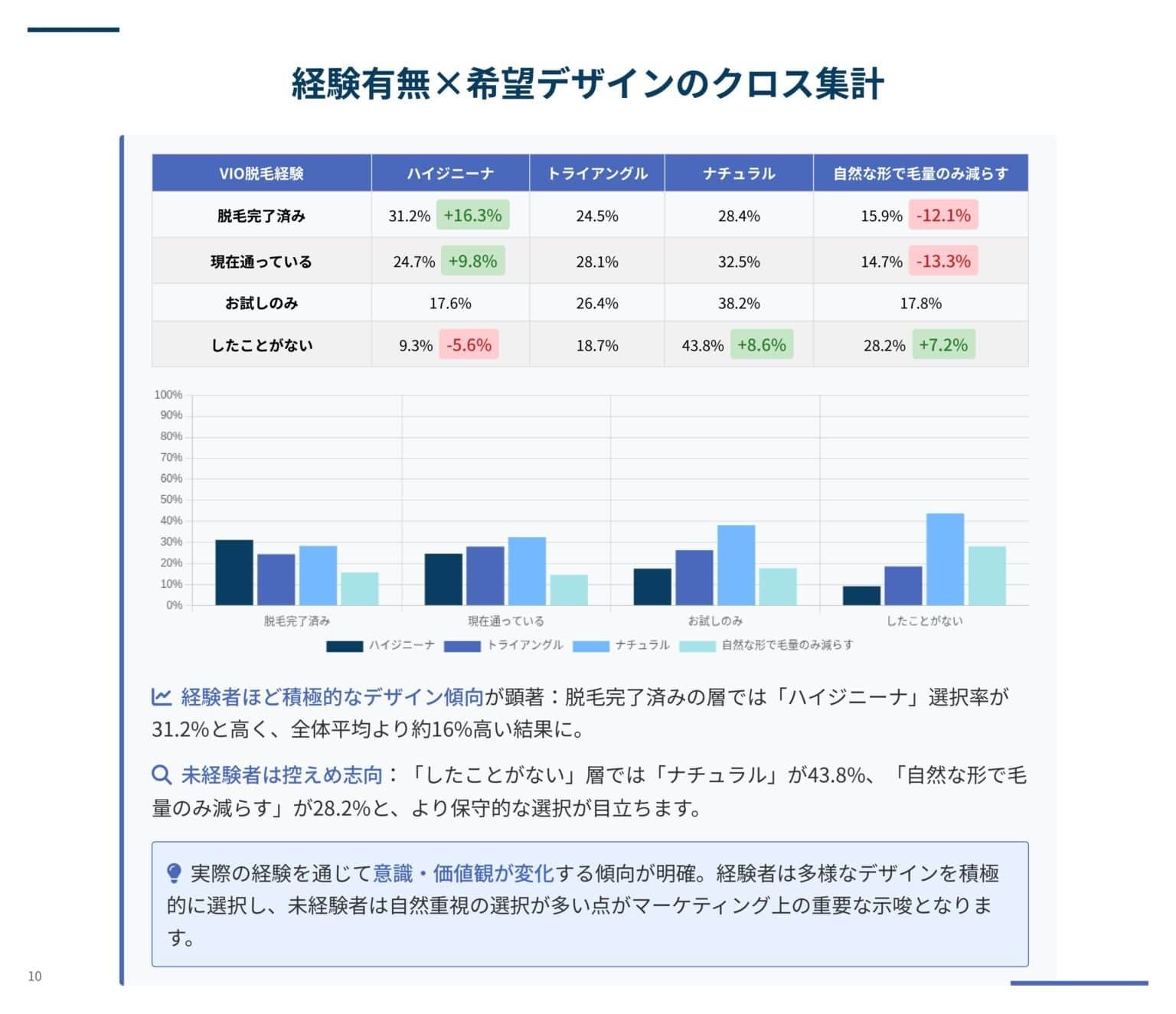 このクロス分析から、世代ごとに異なるVIO脱毛への意識が明らかになりました。若年層は「積極的に脱毛・ハイジニーナ」、中高年層は「自然さや相手の意向を尊重」といった特徴があり、今後の市場動向を占う上で重要な指標となります。
