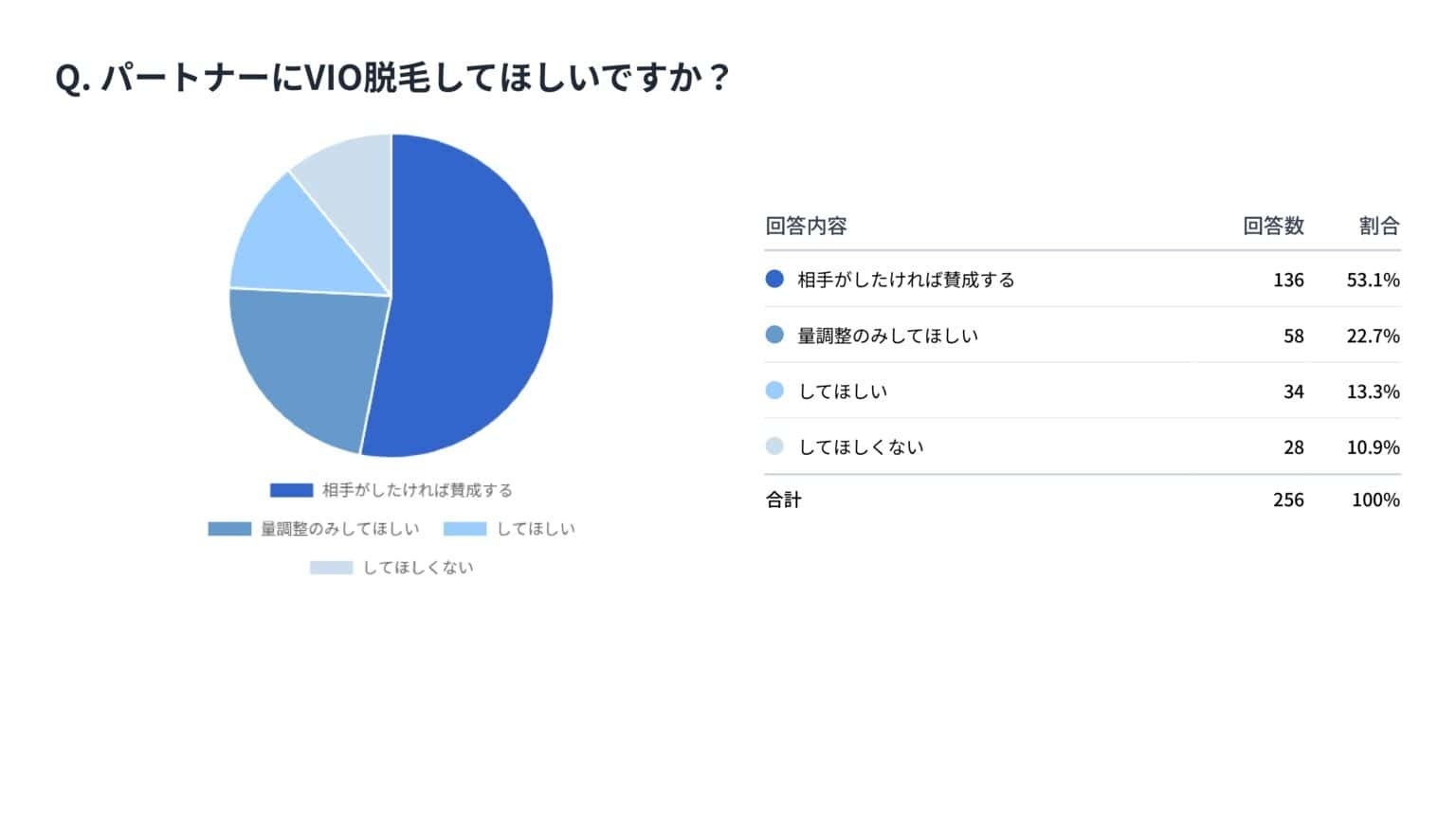 パートナーのVIOに関しては、世代を問わず「自然な清潔感」が好まれる一方で、若い世代を中心にハイジニーナ志向も一定数存在し、男女間の美容意識の変化を示しています。
