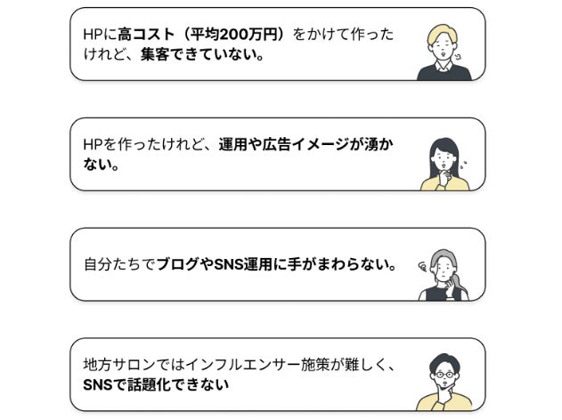 本サービスは、美容サロンが抱える高コストのHP運用・SNS更新の負担・地方での集客格差といった課題を解決し、SEO・SNS・LPを自動連携させることで、低コストかつ持続的な集客力強化を実現します。