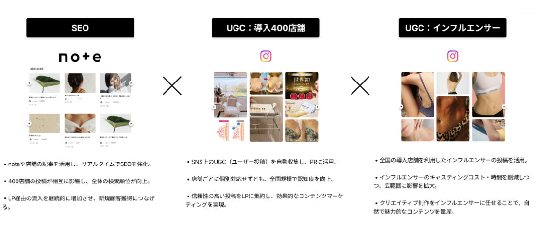 SEO対策の自動化noteの記事を自動収集し、最新情報を反映400店舗全体でSEO効果を強化LP最適化による予約導線強化バストケア、フェイシャル、痩身など施術特化型LPを搭載広告とも連動し、予約・来店率を向上SNS×UGCによる集客効率化店舗やインフルエンサーの投稿を自動収集し、PRに活用コストを抑えつつ全国規模での拡散を実現リアルな体験投稿を活かし信頼性の高いマーケティングを展開