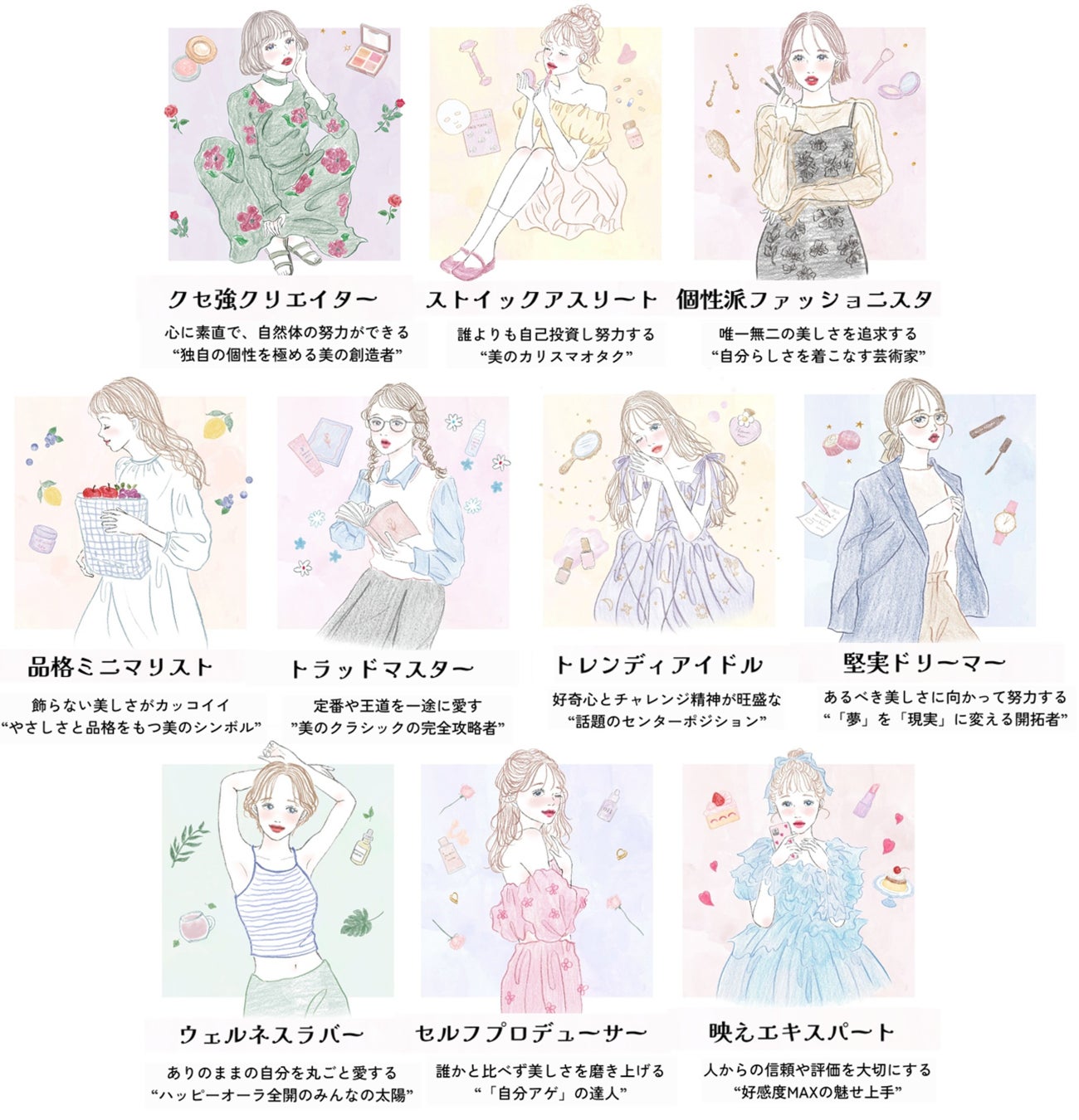 10タイプの“きれいの価値観”には、価値観や考え方の傾向を象徴するネーミングとイラストが付いています。イラストは人気イラストレーター「NAPPY」 さんの描きおろしで、親しみやすく、やわらかなキャラクターが表現されています。「何をきれいと感じるか」「自分らしさや得意分野は何か」など、ぜひ自分の新しい“きれい”との出会いをお楽しみください。