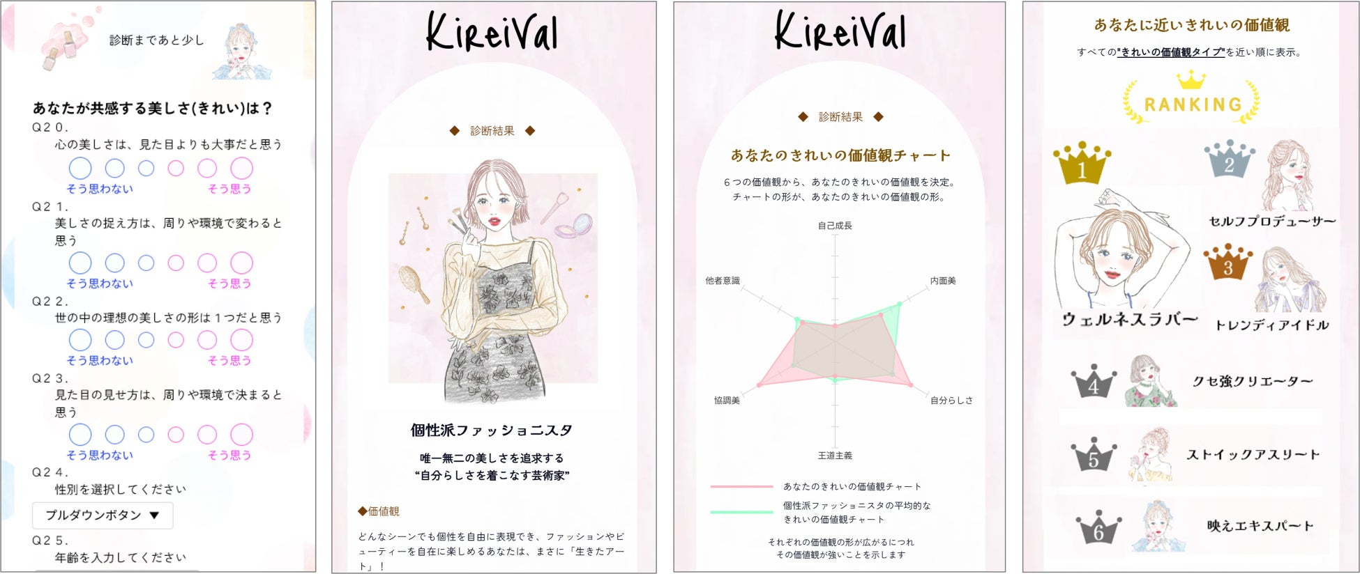 当社では美に対する価値観を通して多様なお客さまを理解すべく、5 年間にわたる価値観研究を行い、世界共通で測定できる独自の心理指標「美容価値観(※1)」を開発してきました。そこで、この知見を活かし、信頼性の高い心理指標に基づいて、美容領域で新たなタイプ診断が提供できると考えました。そこで、美容価値観の心理指標と蓄積した膨大な心理データをもとに、“きれいの価値観”をタイプ別に分ける独自のアルゴリズムを開発し、きれいの価値観タイプを診断するWebサービス「KireiVal」を実現しました。