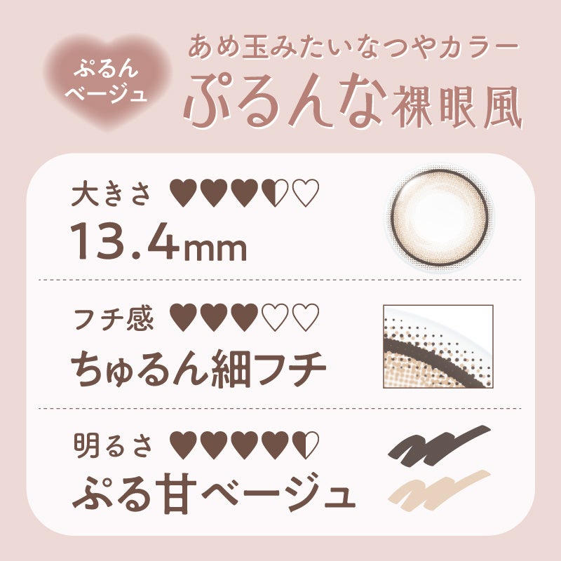 ぷるぷるでつや感たっぷりの儚げベージュ。光を宿す白みベージュと超極細フチでぷるんと透けるような瞳に。