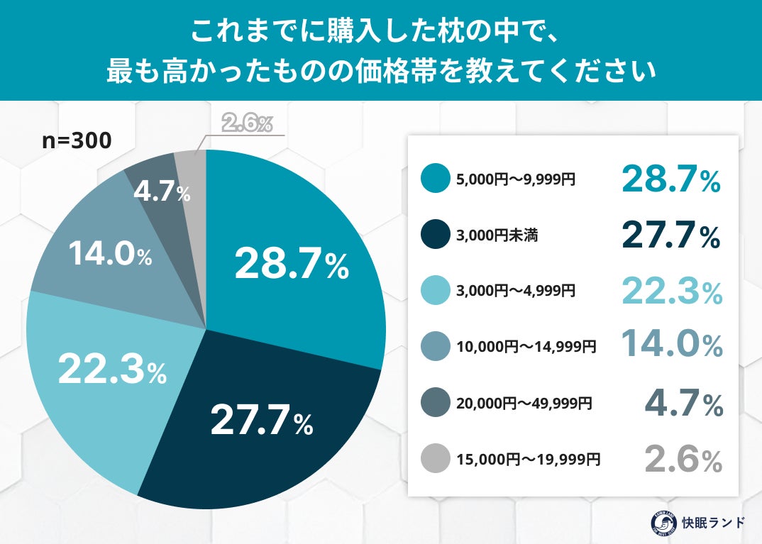 →これまでに購入した枕の最高価格帯は、約8割が1万円未満にとどまった。一方で、**1万円以上の高価格枕を購入した経験がある層は約20%**おり、一定数が「高級枕を試してみたい」「快眠に価値を感じている」層として存在している。