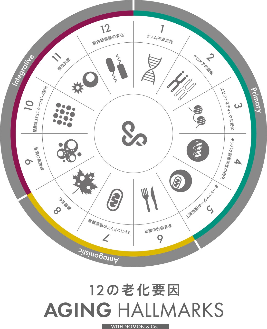 NOMON&Co.は12の老化要因「AGING HALLMARKS」を指標として研究し、ヘルスケアブランド「NOMON」を通じて、老化の要因にアプローチするエビデンスのある食品(ニュートラシューティカルズ)の提供をしています。
