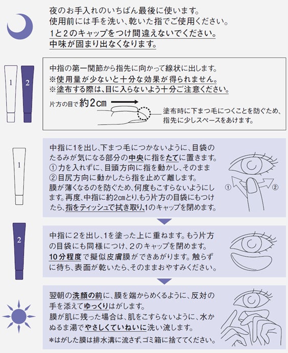 肌表面に形成した”疑似皮膚膜”がゆるみがちな目袋の凹凸をフラットに補正。一晩中、引き締まり感を実感。寝ている間中、うるおいを密封し、翌朝、膜をはがした瞬間、明るく生き生きとした目もとへ。