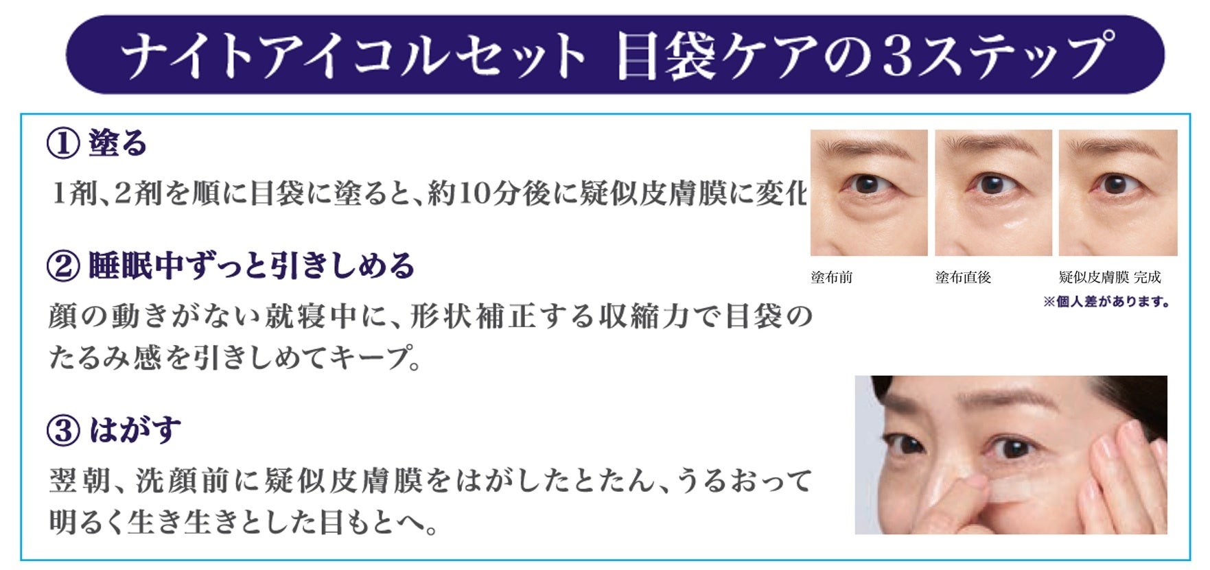ナイトアイコルセットの「塗る疑似皮膚膜」で、睡眠中にじっくり目袋ケア。