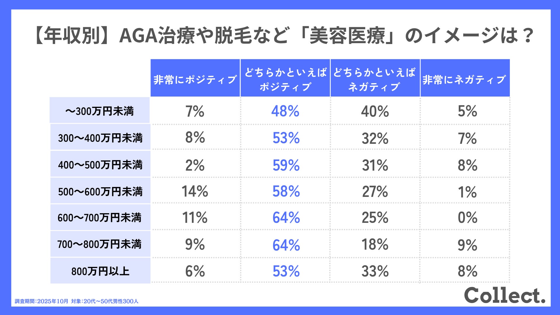 年収が上がるにつれて、美容医療に「ポジティブ」と回答する割合が高くなる傾向が明確に見られました。
