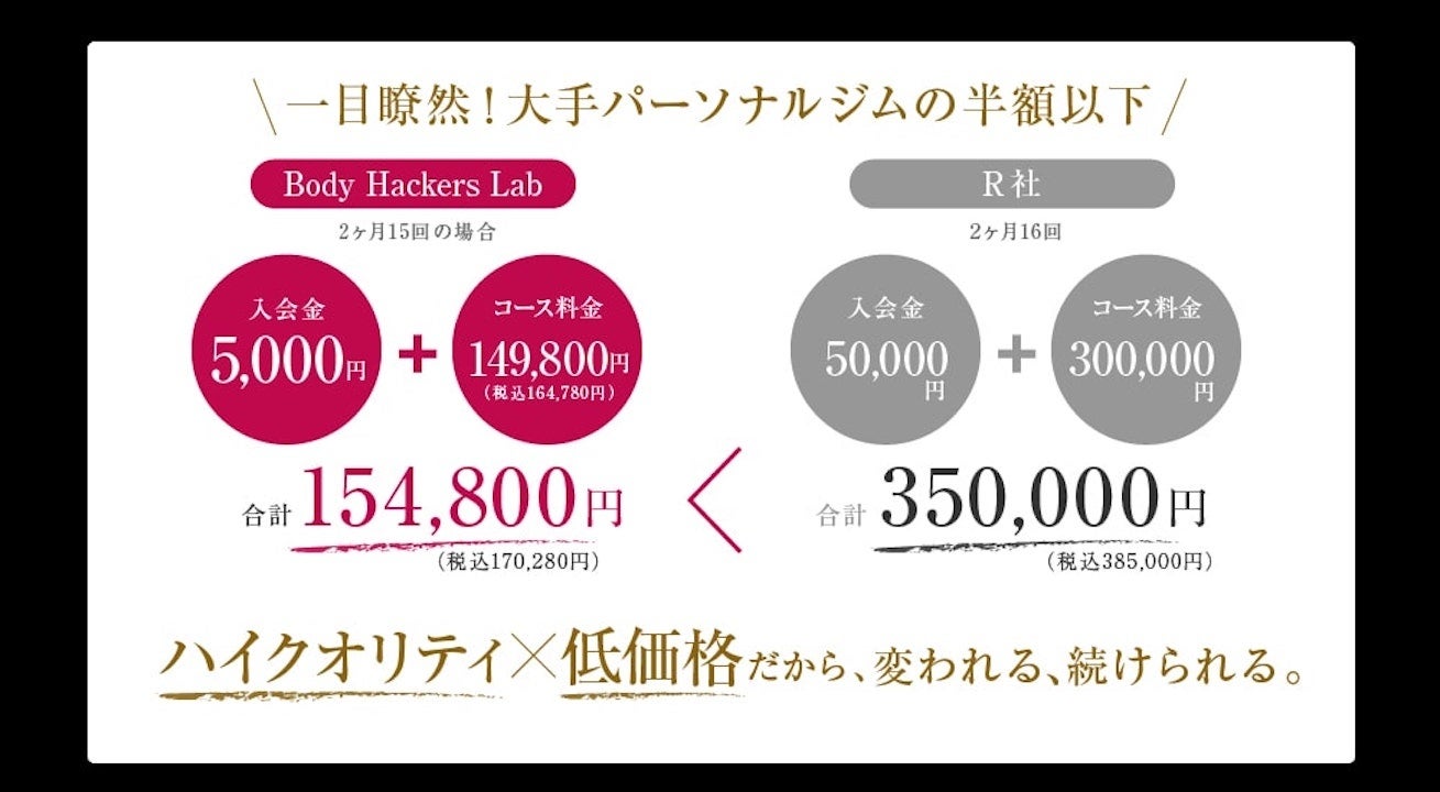 大手では2ヶ月30万円以上が相場ですが、ルルピラではその半額程度で「人生変える」体験を提供可能。