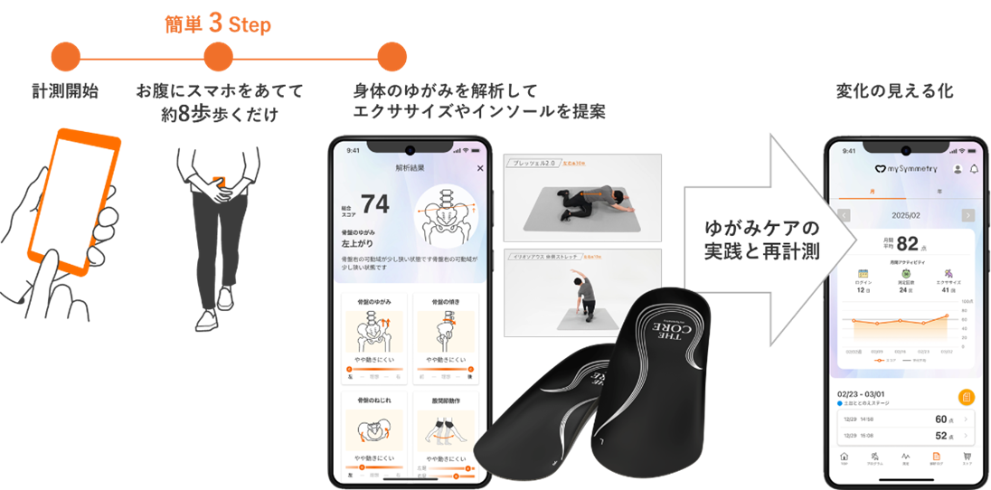 世界初*、スマホをお腹にあてて歩くだけで姿勢のゆがみをとらえ、バランスよい体に整える個人向けスマホ用アプリ:「my Symmetry」