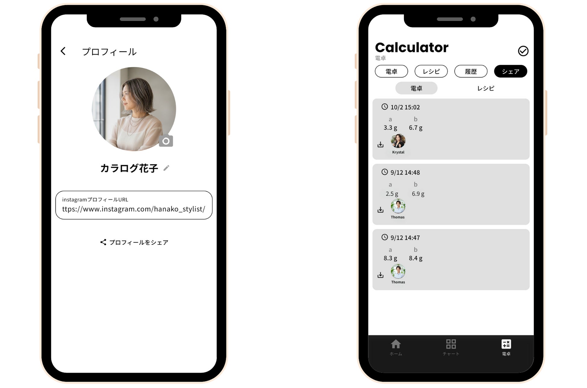また、自動で調合計算ができる電卓機能、マイチャート機能、レシピ機能、シェア機能などを搭載し、現場でのヘアカラー選定や共有をサポートします。