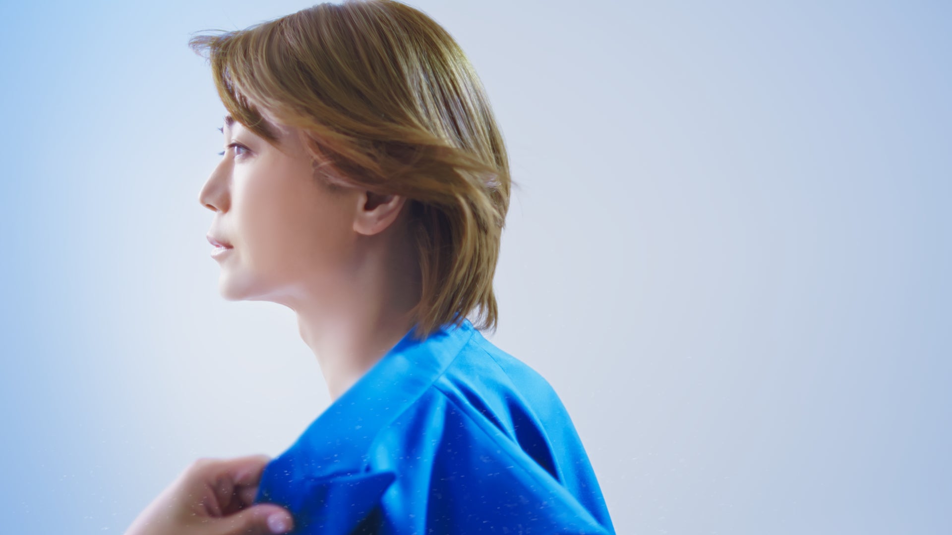 カラーである青い色のジャケットを素肌に纏った氷川さんが、爽やかな風に吹かれて登場。