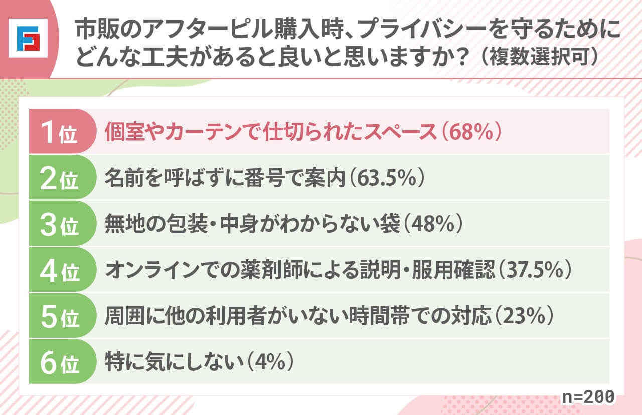 アフターピルを市販で購入する際、プライバシーを守るためにどのような工夫があると良いか尋ねたところ、「個室やカーテンで仕切られたスペース(68.0%)」が最も多く挙げられました。