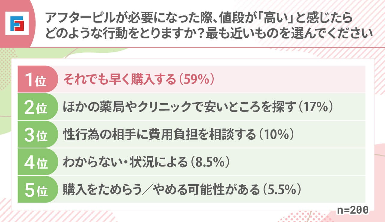 アフターピルが必要になった際、「高い」と感じた場合の行動について聞いたところ、最も多かった回答は「それでも早く購入する(59.0%)」でした。
