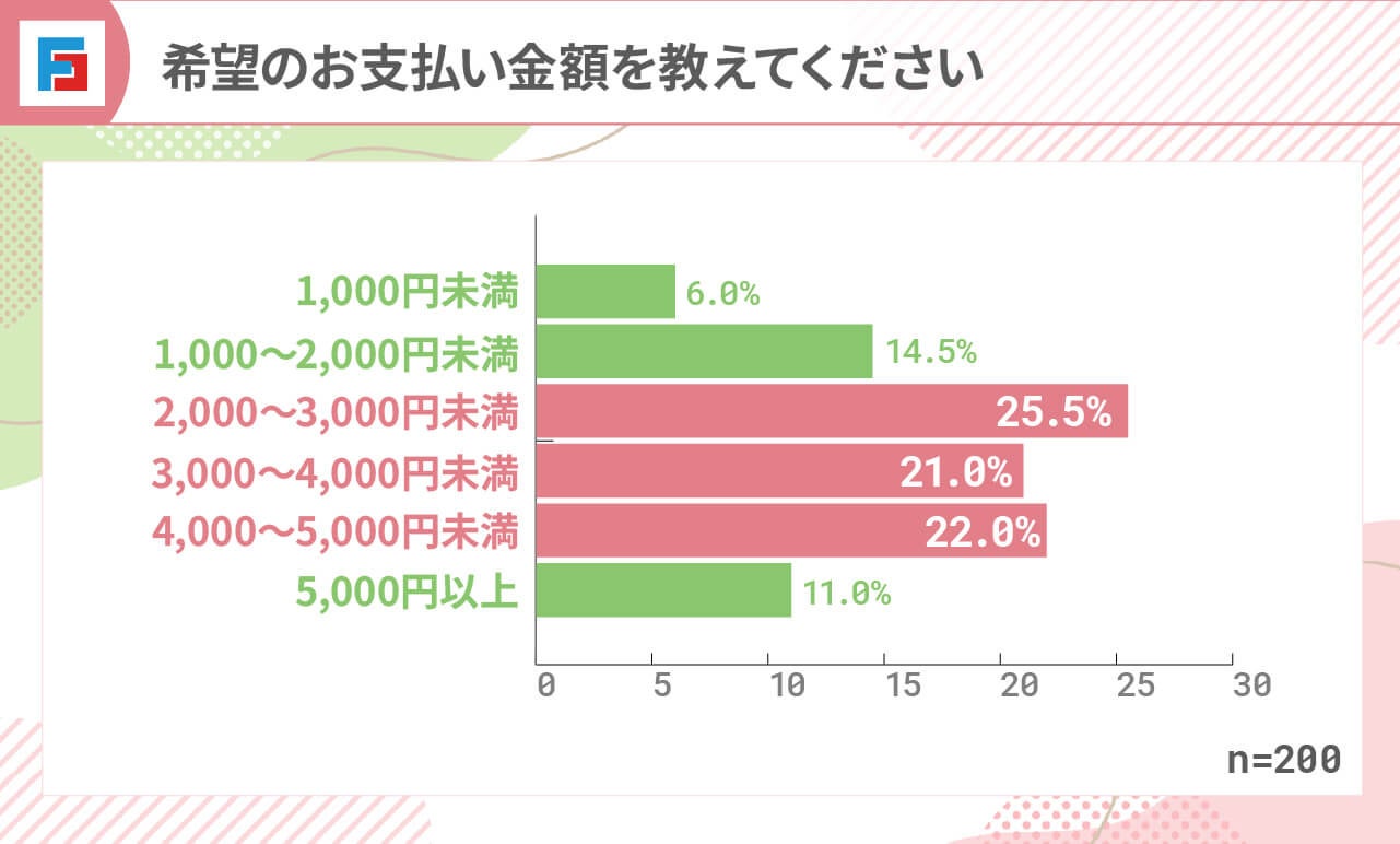 希望する支払金額として最も多かったのは「2,000~3,000円未満(25.5%)」でした。次いで「4,000~5,000円未満(22.0%)」、「3,000~4,000円未満(21.0%)」と続きました。