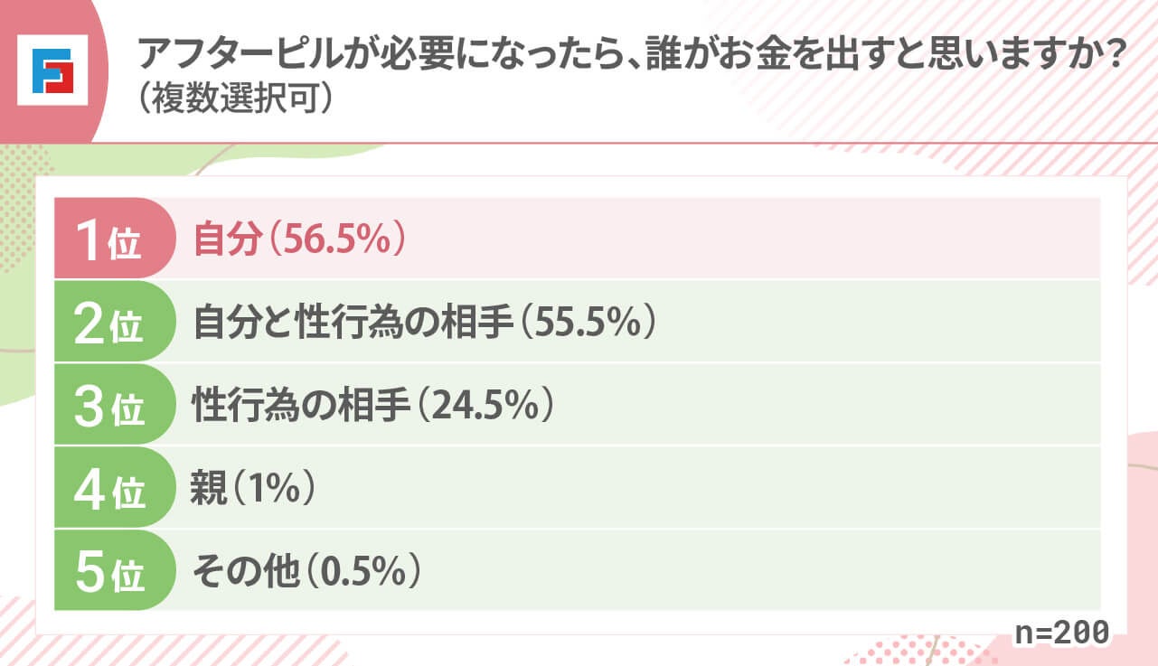 アフターピルが必要になった際の費用は誰が出すと思うか聞いたところ、「自分(56.5%)」が最多となりました。