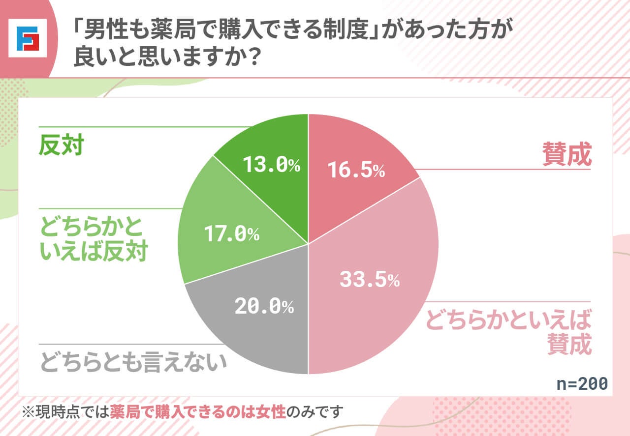 「男性も薬局で購入できる制度」については、「賛成(16.5%)」「どちらかといえば賛成(33.5%)」と、賛成派が合わせて50%になりました。