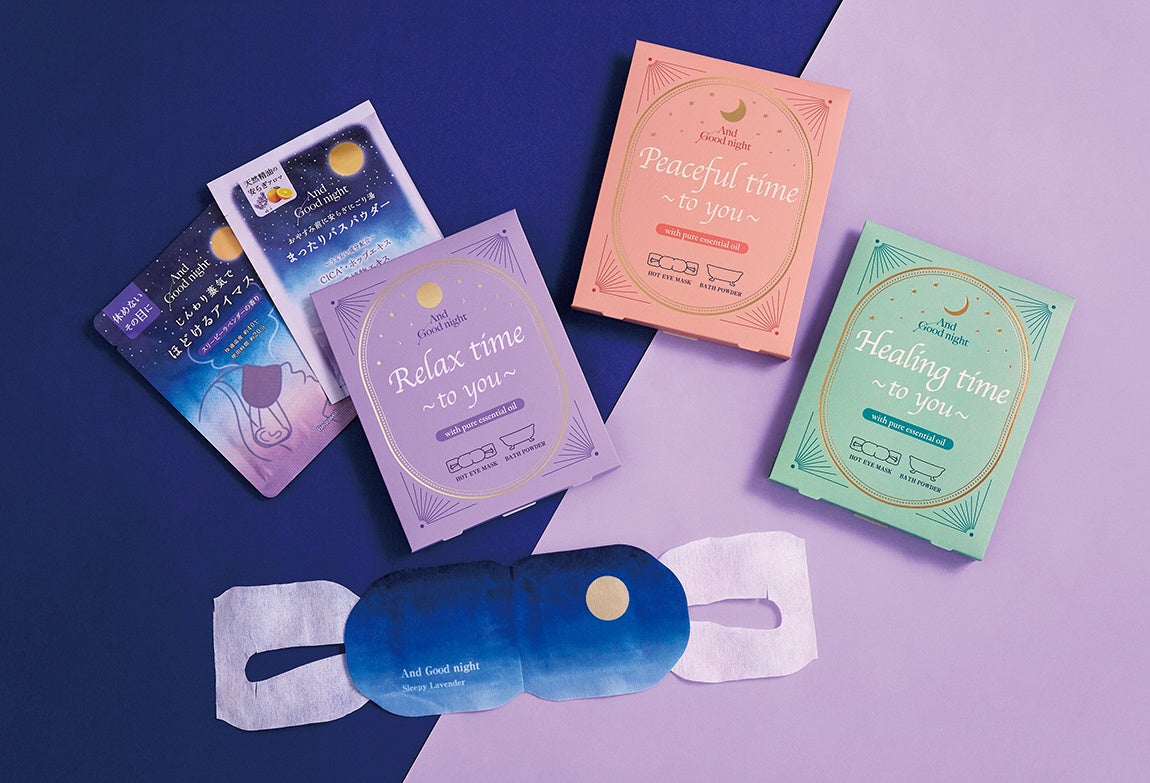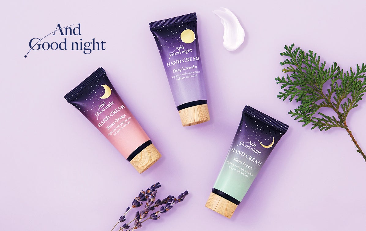 良い眠りは良い準備から。「入浴・沈静・芳香浴」の3stepと天然精油の安らぎアロマでおやすみ前のナイトケアルーティンを提案する『アンドグッドナイト』。心地よい明日へつなぐ、リラクゼーションアイテムが揃います。