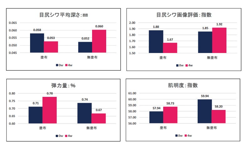 目尻シワの深さ・唇シワの軽減・肌のハリ・明るさ・化粧ノリの改善など、多方面で有意な改善が確認されました。