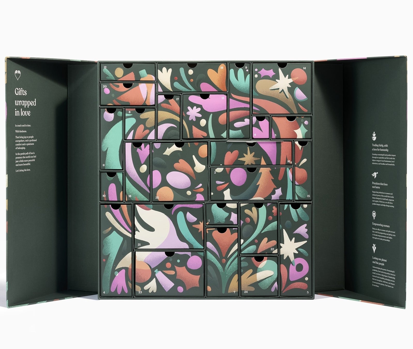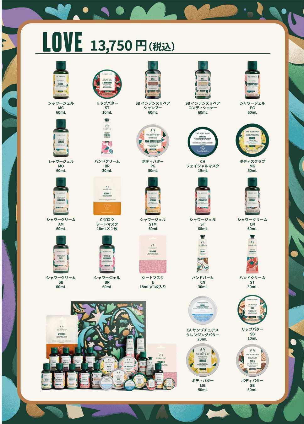 2025年のホリデーコレクションのテーマは「WRAPPED IN LOVE」です。ザボディショップの製品・ギフトは、パッケージから原材料の調達、製品の仕上げまで、携わるコミュニティへの愛とケア、地球への優しさ、あらゆる面で愛に包まれています。フルーツや花、平和の象徴の鳩やハートなど、さまざまなモチーフで構成されたアドベントとホリデーのパッケージデザインは、人と人とのつながり、ブランドパーパスである「使う方を応援し、社会を向上させる」という思いを表現したものです。