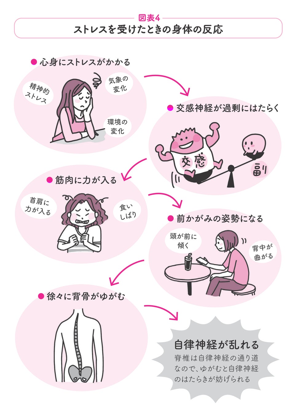 自律神経は背骨の中を通っています。そのため、背骨がゆがんでいると、自律神経の通り道が妨げられ、自律神経はうまくはたらくことができません。