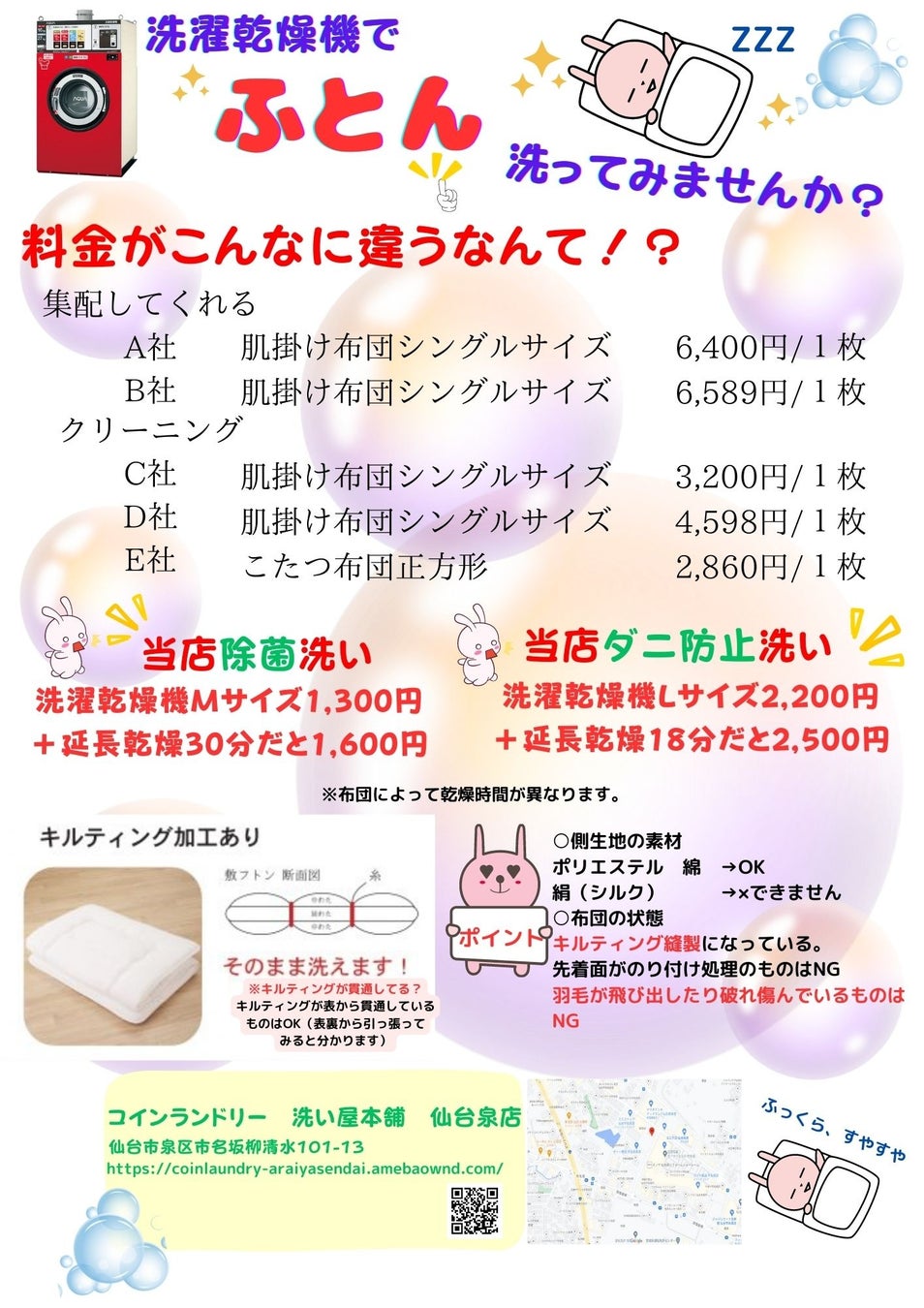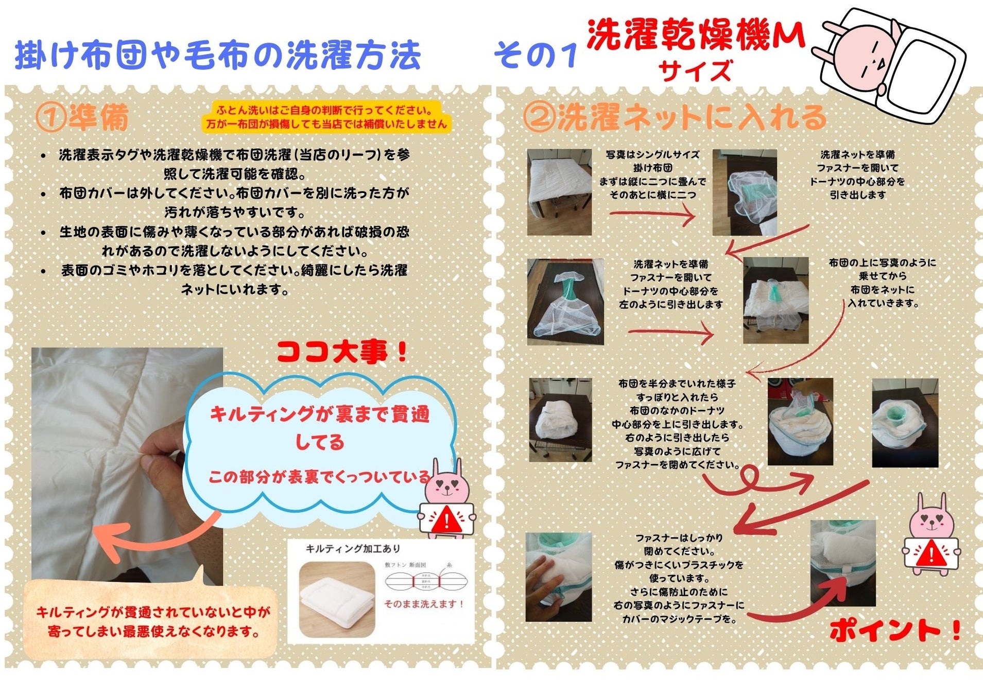 店舗内にチラシを作成しましたが基本的には洗濯物の表示の確認をお願いしています。特に敷布団はウレタン、真綿などの素材が水洗いには注意が必要です。タオルケット、毛布、肌掛け布団、羽毛ふとん、コタツ布団等はキルティング加工してあるのは洗えます。