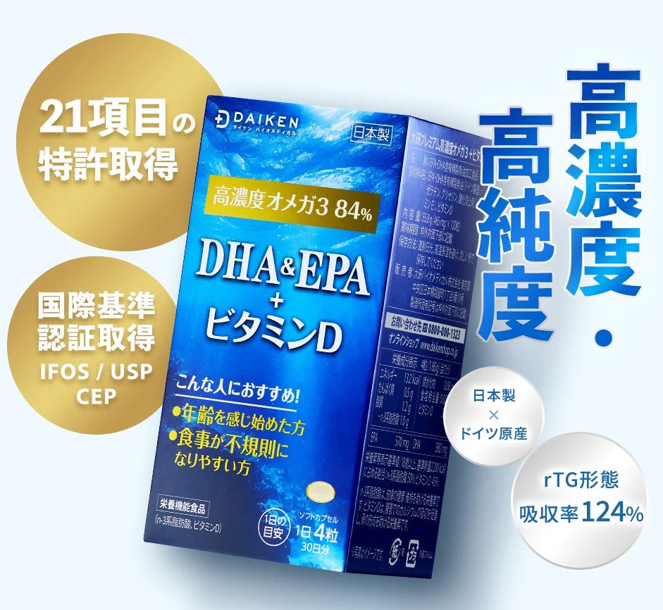 弊社はこうした課題を踏まえ、国内最高水準級のオメガ3濃度98.3%(n-3系不飽和脂肪酸)という高純度品質を実現した「DHA&EPA+ビタミンD」を提供しています。