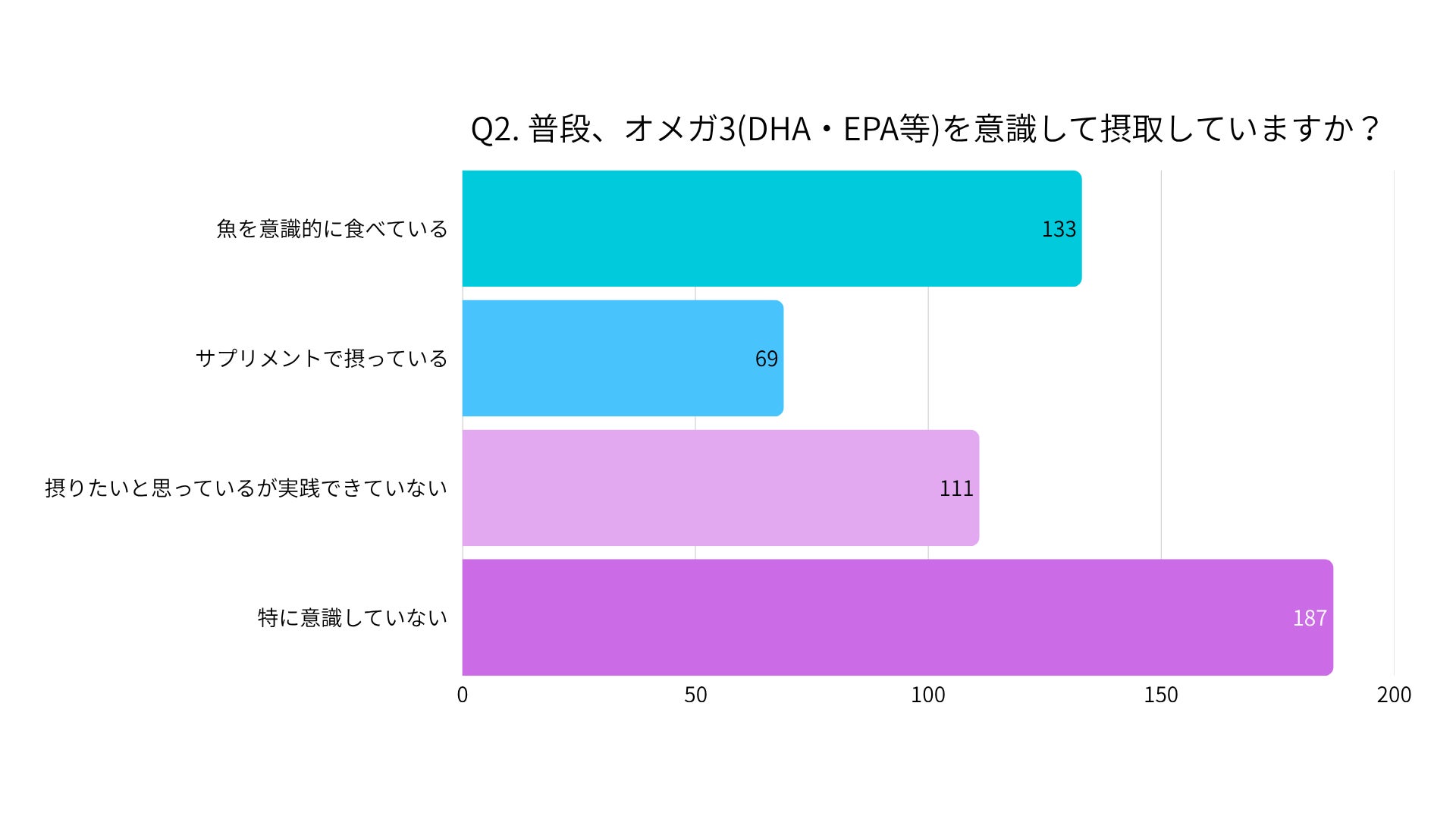 「普段オメガ3(DHA・EPA等)を意識して摂取していますか?」の問いに対しては、「特に意識していない」が37.4%(187人)、「摂りたいが実践できていない」も22.2%(111人)と、約6割が不十分な摂取状況にあることが考えられます。