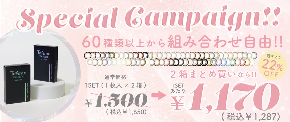 TeAmoのマンスリーカラコンは業界では珍しい、1セット(1箱1枚入×2)での販売となっており、両目度数が異なる方でもお手軽にお試しいただけます!