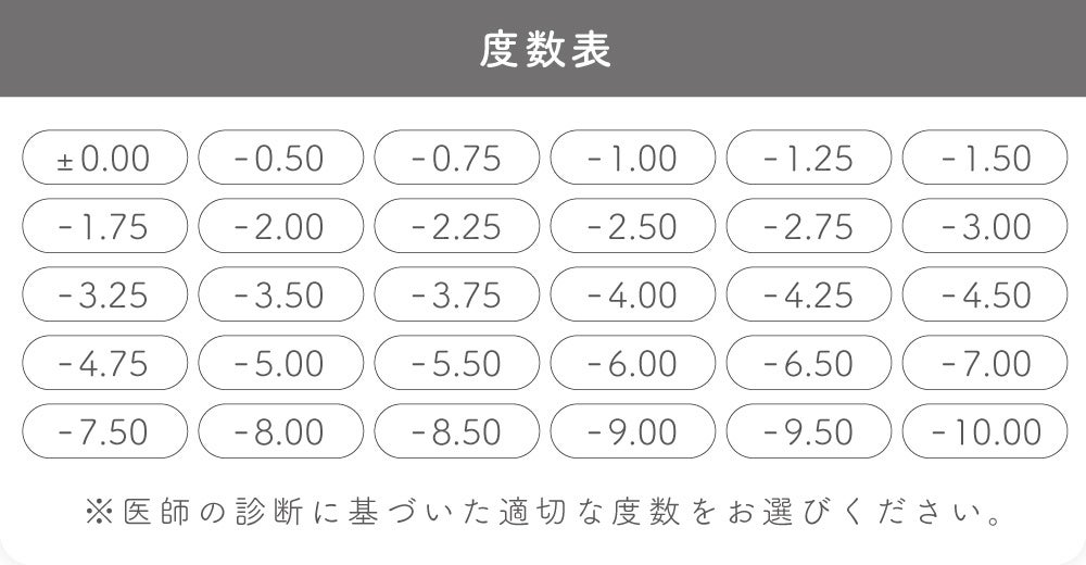 度なし(±0.00)から-10.00まで、豊富な度数展開もご用意しておりますので、幅広い度数の方にお使いいただけます。