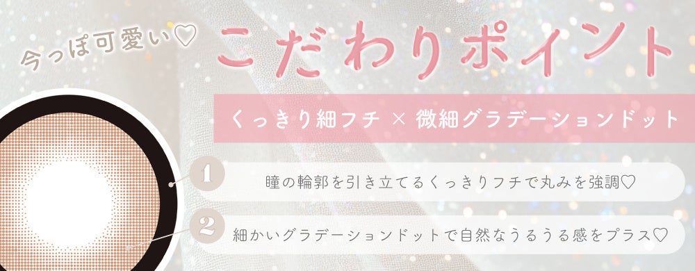 瞳を引き立てるくっきりまんまるフチ×細かいグラデーションドットでまんまるちゅるんな瞳に。