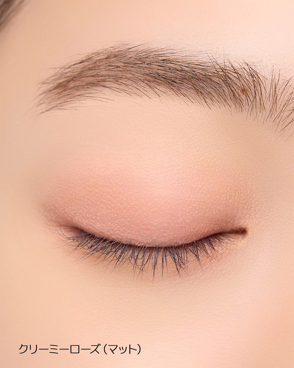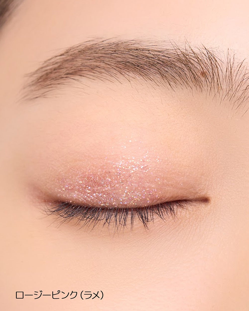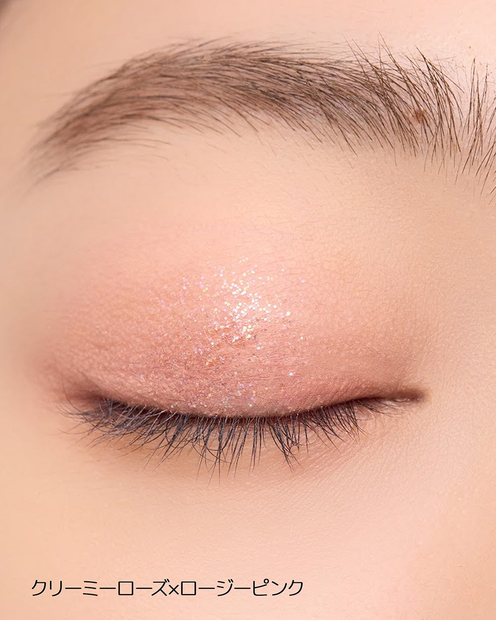 目元に血色感と柔らかさを与えるマットなクリーミーローズカラーと温かみのあるアクセントをプラスできるロージーピンクのラメの組み合わせ。