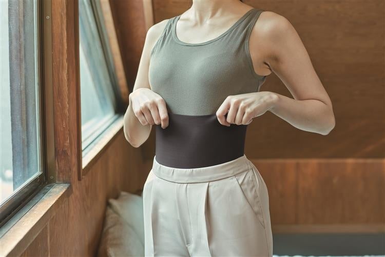 肌面が微起毛になっている薄手の腹巻き。身体にフィットしやすいシームレス仕様の生地。