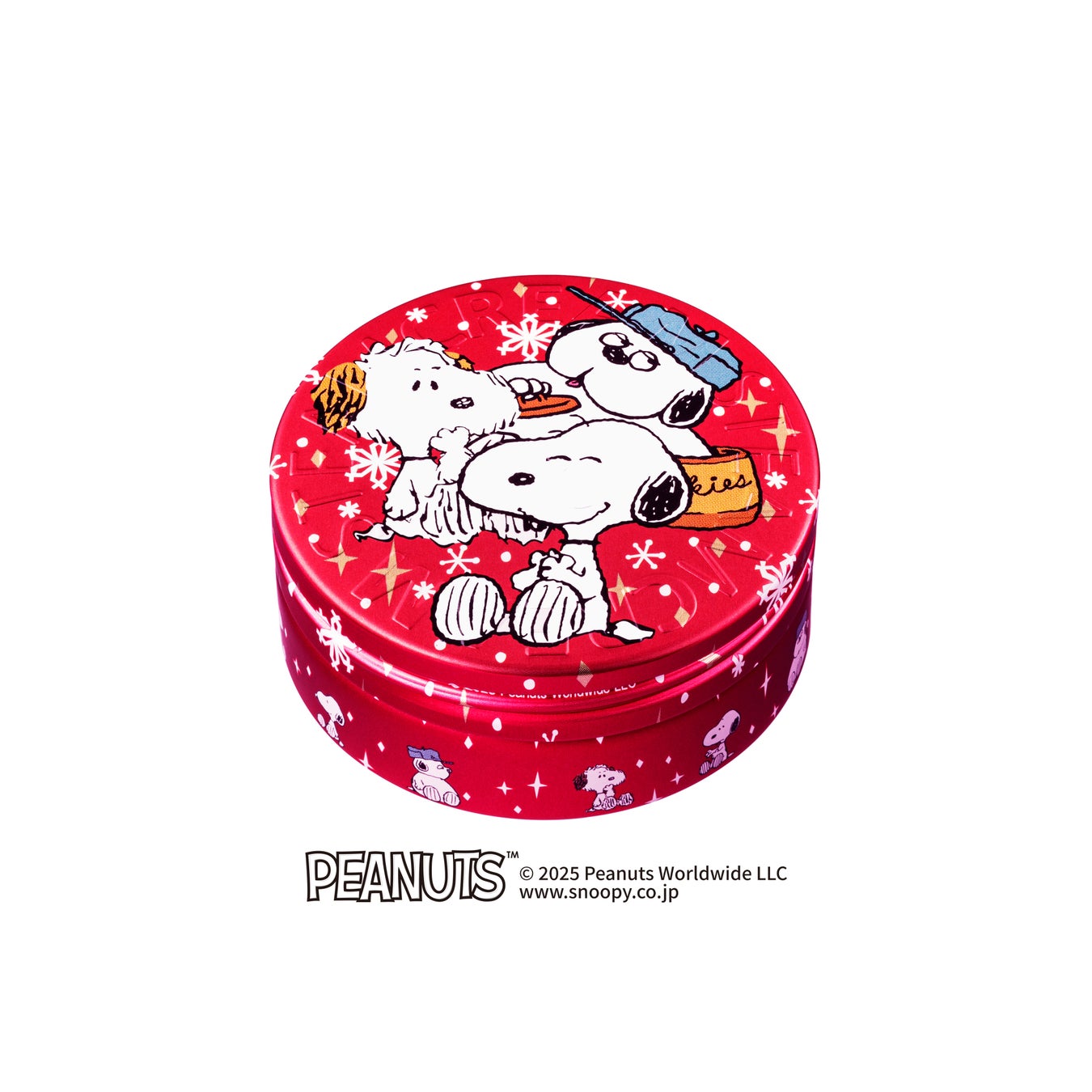 缶の側面には、午に乗るスヌーピーとウッドストックがたくさん。
