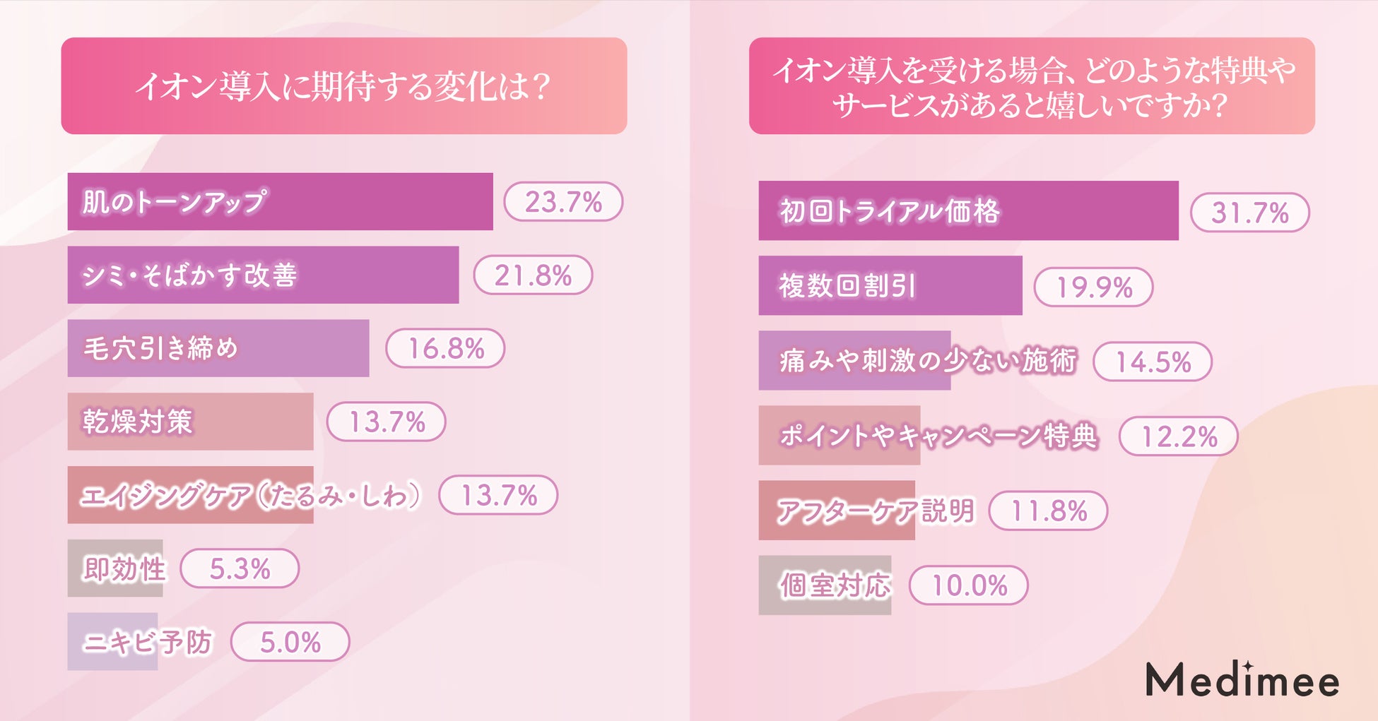 また、イオン導入を受ける際に“あると嬉しい特典やサービス”として最も多かったのは「初回トライアル価格」でした。初めての美容施術に対しては、「効果があるか不安」「続けられるか分からない」といった心理的ハードルがあるため、まずは手頃な価格で試したいというニーズが強いことが分かります。