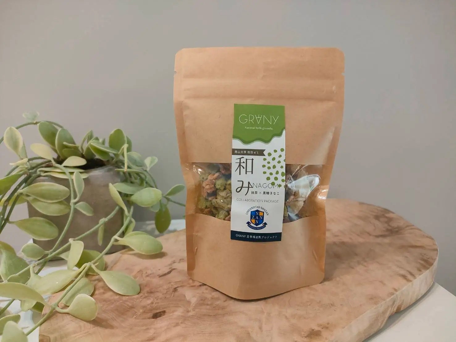 学生たちがGRANYに並ぶ多数のグラノーラとトッピングの中から素材を選び、自分たちでブレンドを考案して商品化したのが『和み』です。初年度はパッケージ、昨年度は環境に配慮したデポジット瓶で展開。そして今年は、学園祭での持ち帰りやすさを考慮し、再び“食べ切りサイズのパッケージ”として復活します。環境への配慮はそのままに、より多くの方に手に取っていただける形で販売を行います。