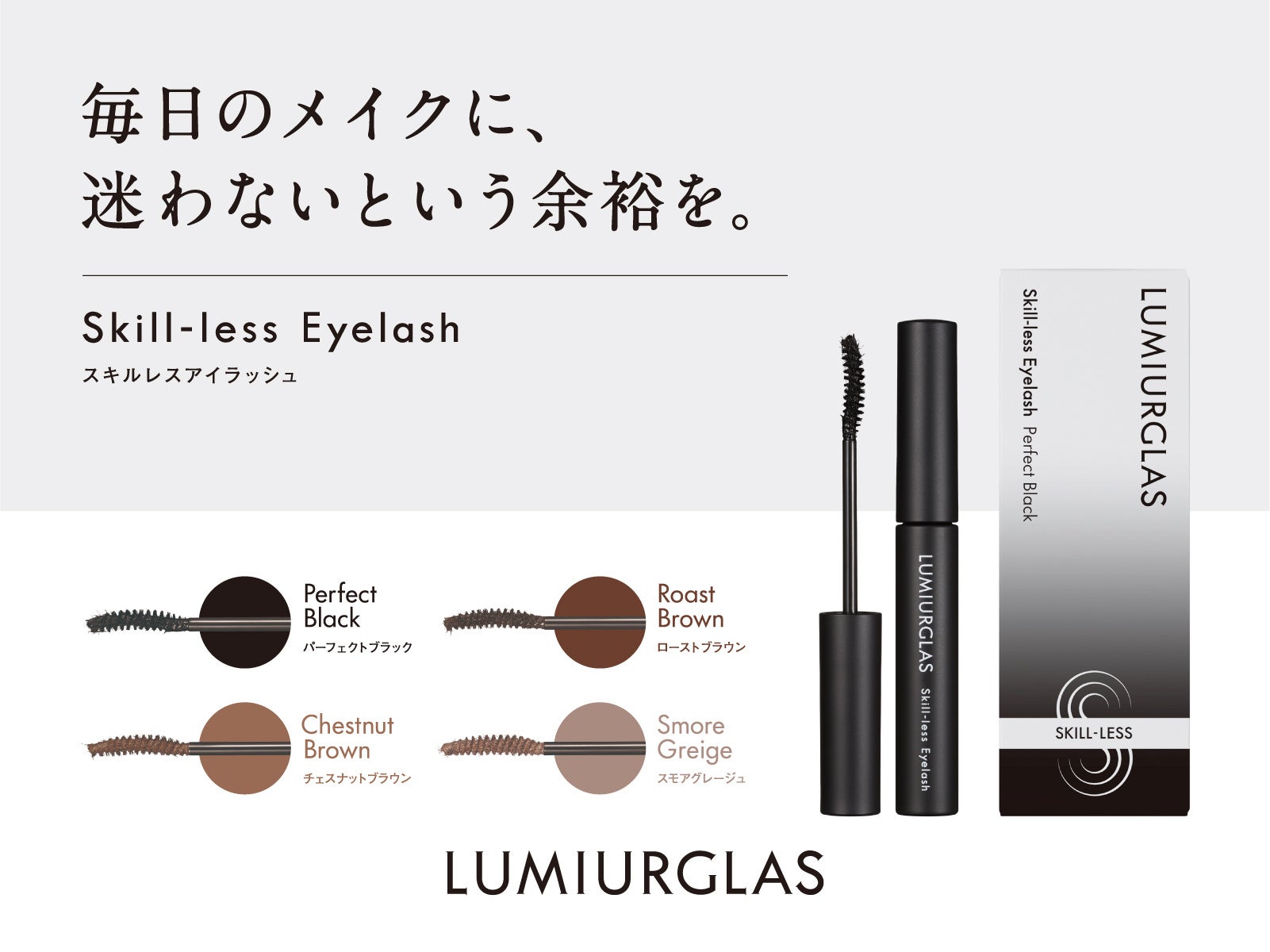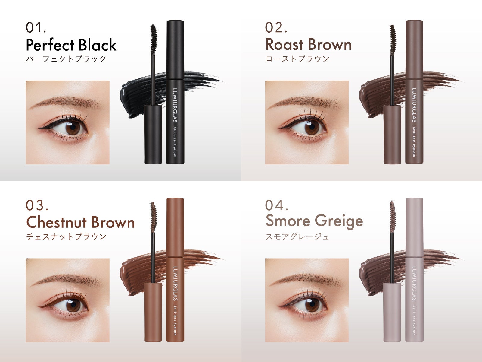 すべて、LUMIURGLASの「スキルレスライナー」と同色設計で開発。マスカラとアイライナーを同色で揃えるだけで、目もとに自然な統一感と洗練された”ワントーンアイ”が生まれます。
