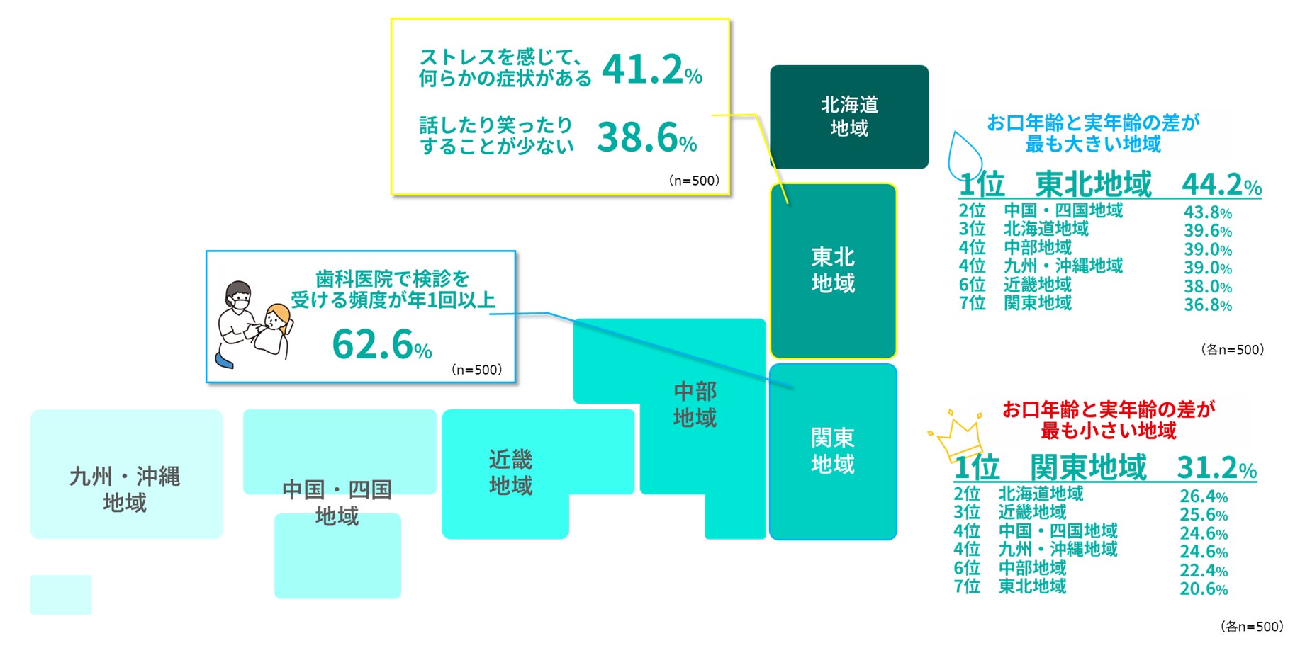 ③ お口年齢の差が最も大きかったのは「東北地域」と判明!最も差が小さい「関東地域」は「歯科医院で検診を受ける」頻度が高く、ストレス要因にも地域差。
