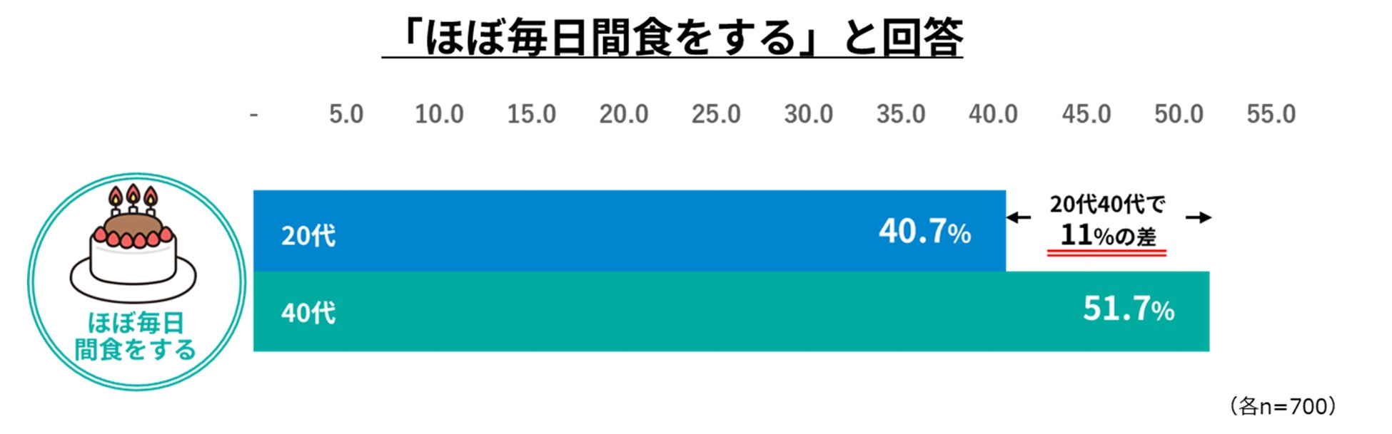 ② 最も“お口年齢”が高い40代の約半数が「ほぼ毎日間食する」と回答