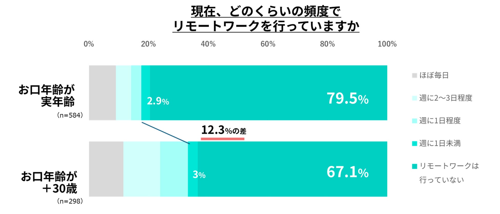 ④ 実年齢に近い結果となった82.4%が「リモートワーク週1回未満」と回答!おうち時間の長さが“お口年齢”に関係?